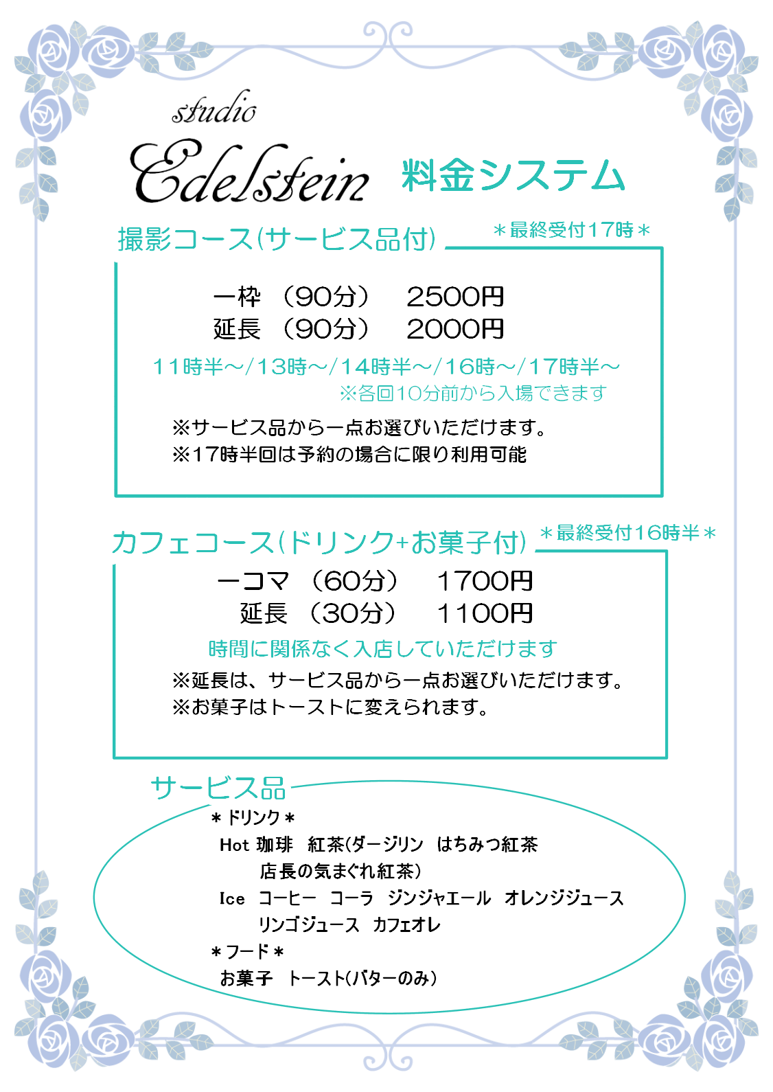 6名様以上は500円ずつ料金がアップします。 - カフェスペースのみのご利用 60分 1700円(入店時間から60分・最終受付16時半)