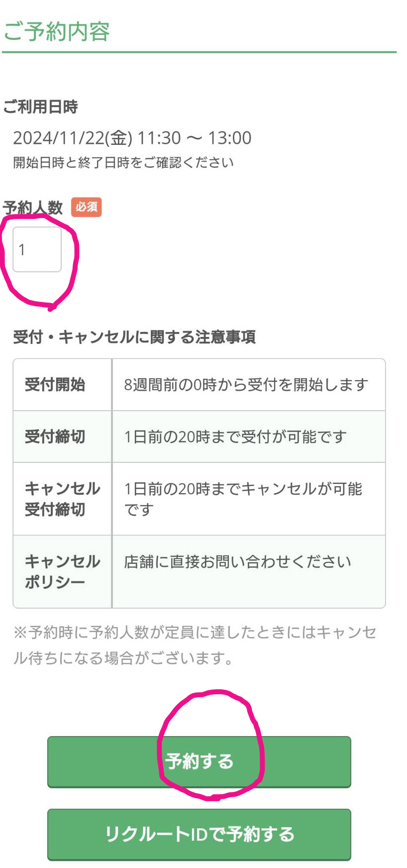 3、一番上の時間があっていたら、上はケーキ関連の予約方法なので、下までスクロールして予約人数を入れたら予約するボタンを押す
